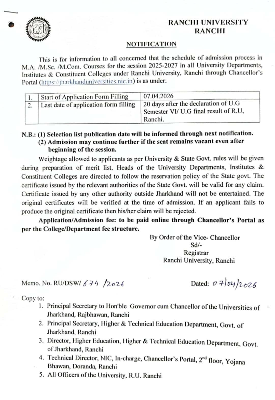 If you’re planning to pursue a Master’s degree (PG) in fields like Arts, Science, Commerce, or Professional courses, this is a great opportunity to secure admission in one of Jharkhand’s top universities.